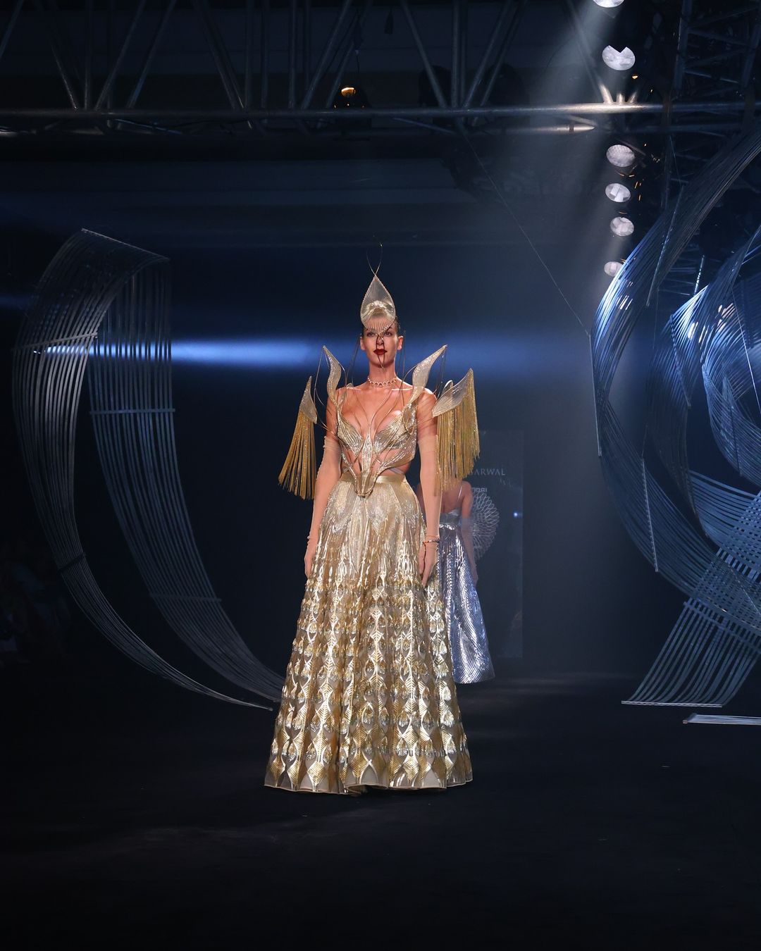 In the heart of Amit Agarwal's fashion show, the "Coronal Loop" stands as a monumental bamboo installation, a vision of the future woven with the wisdom of the past. Spanning 16 feet in diameter and rising 10 feet high, this hyper-futuristic structure is a testament to the fluidity and grace of bamboo, sculpted into a form that captivates and inspires.