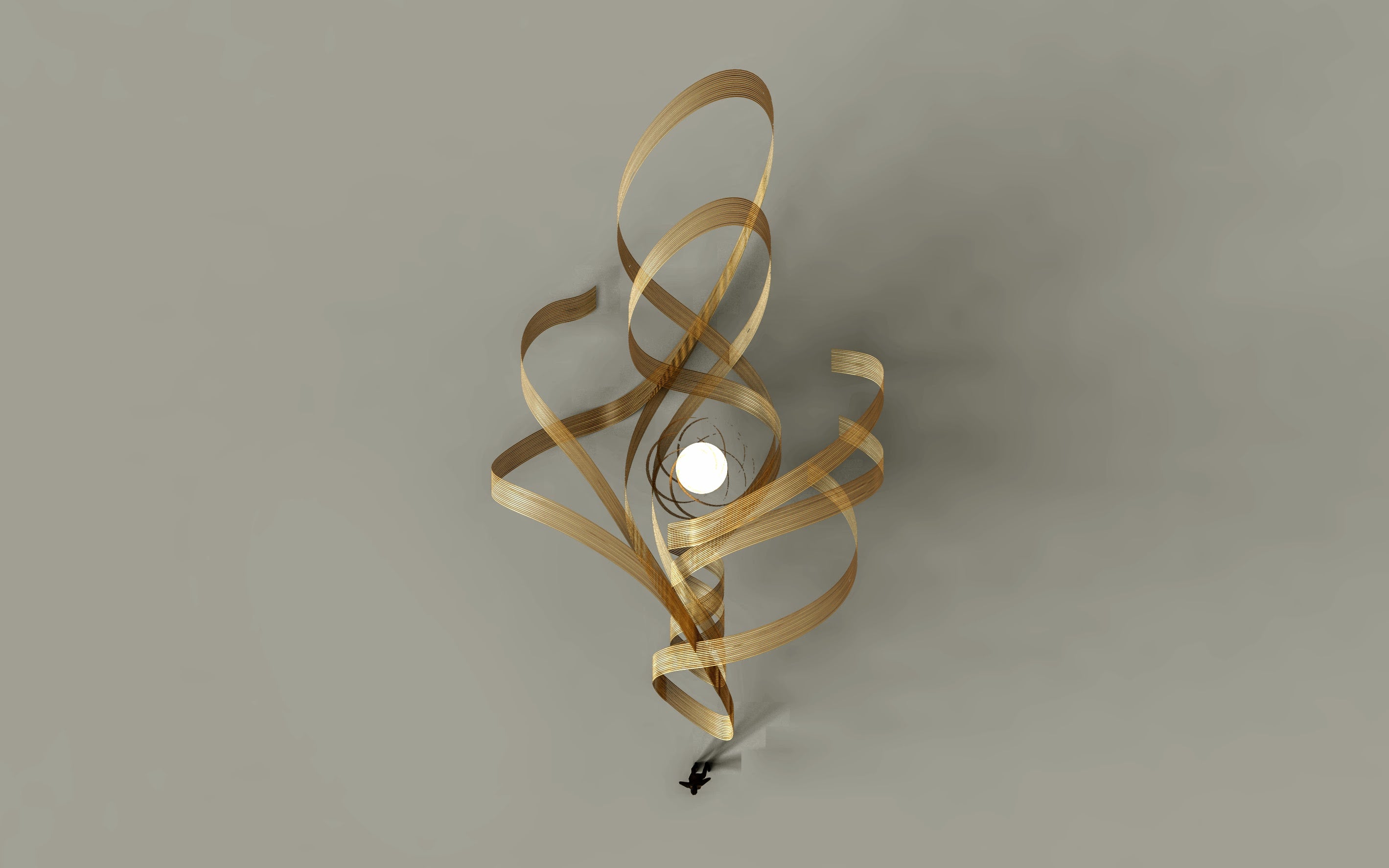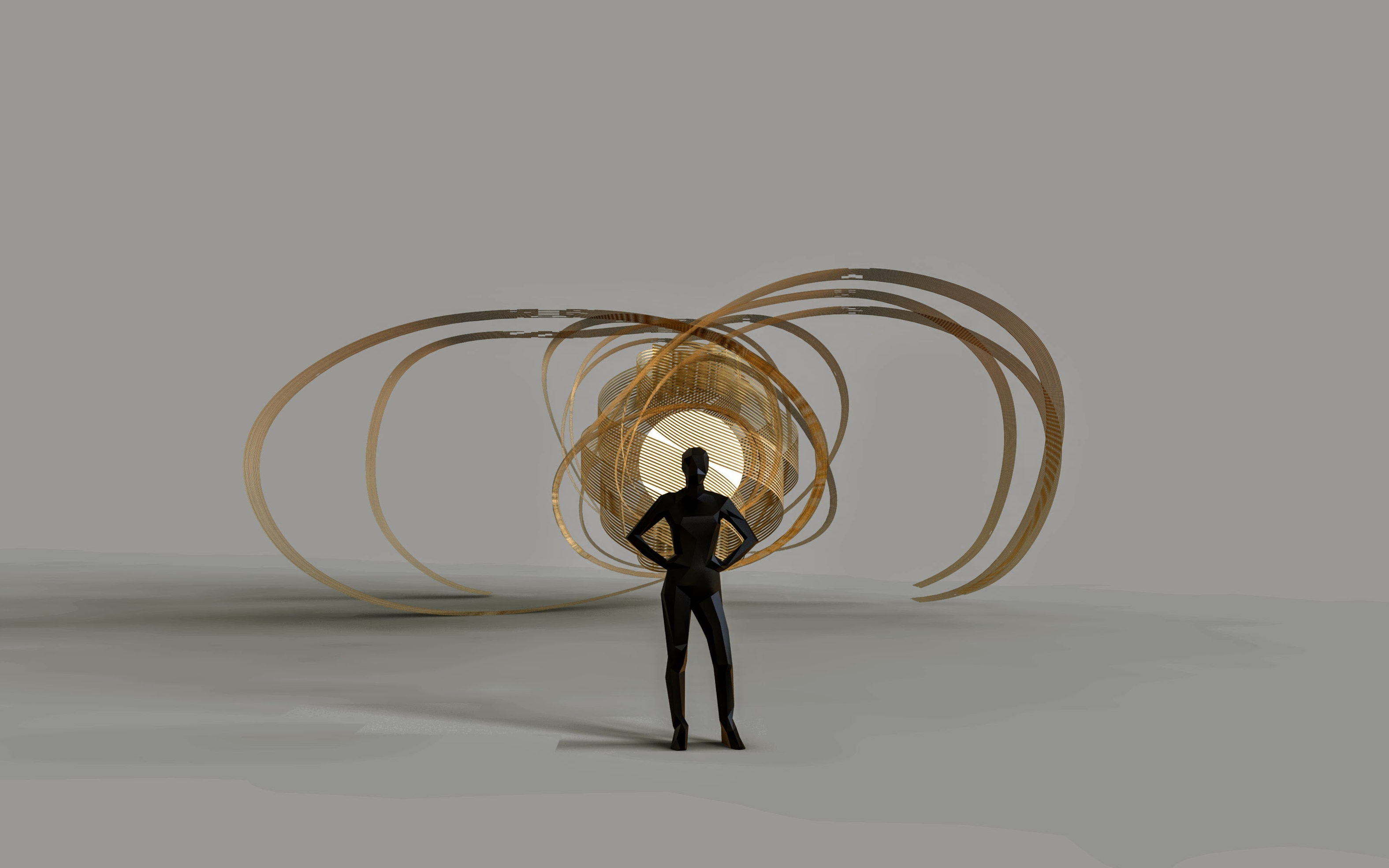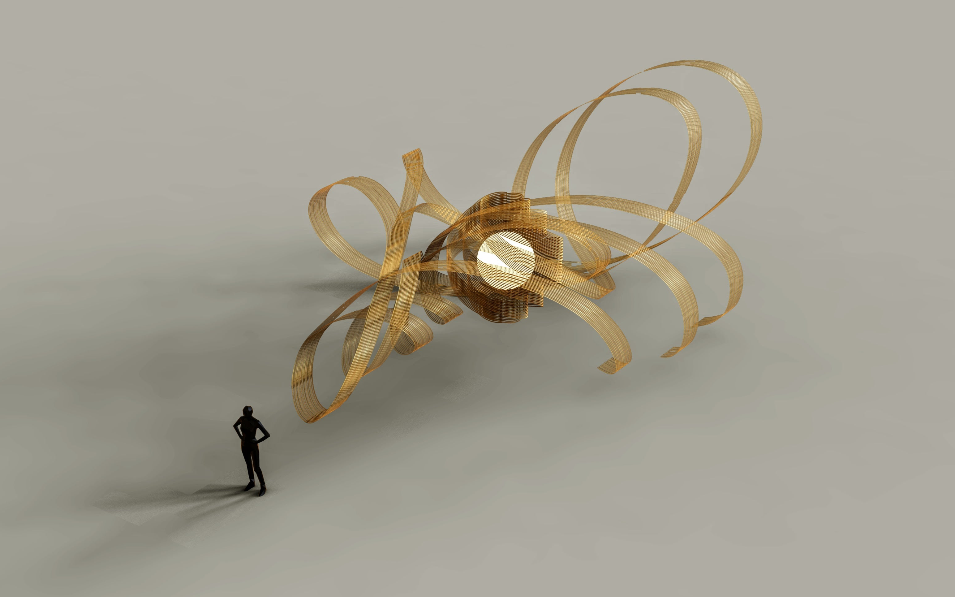 Crafted from bamboo—a material revered for its sustainability, flexibility, and strength—the "Coronal Loop" honors the natural world while pushing the boundaries of modern design. The installation’s flowing slivers of bamboo create dynamic, interwoven curves and spirals, embodying movement and energy. The play of light and shadow within these organic forms adds an ethereal quality, making the structure appear almost alive.