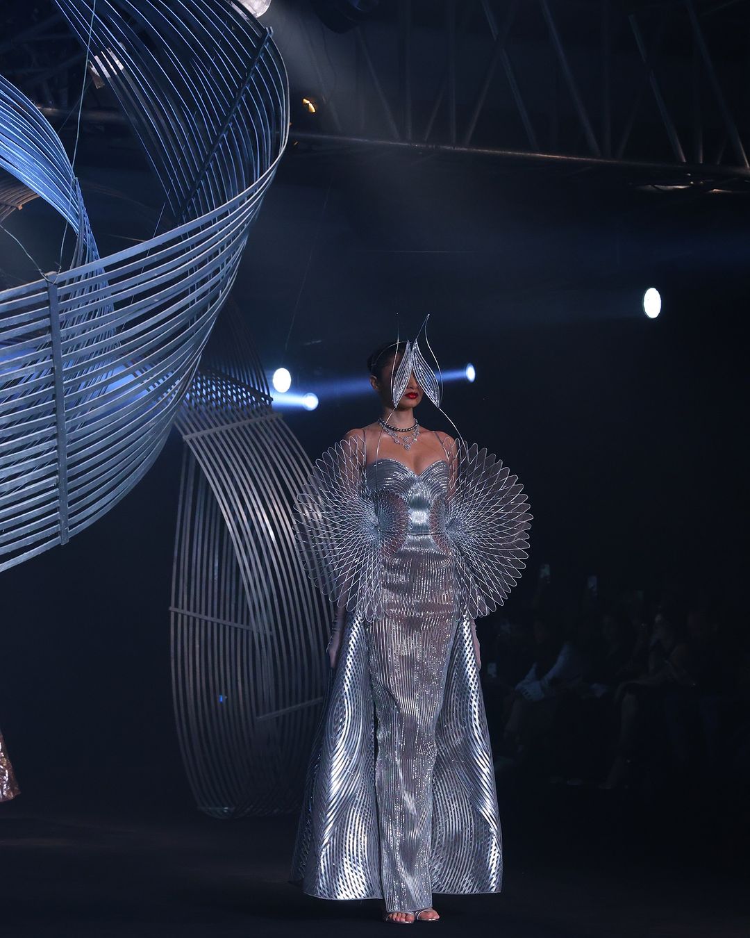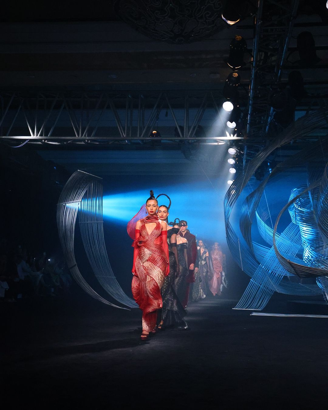 The installation seamlessly integrates with the themes of the showcased fashion collections. Each collection—from the sun-kissed hues of The Aureliar Clan to the fluid forms of The Liquescents—is reflected in the intricate details of the bamboo design, creating a narrative that connects fashion, nature, and innovation.